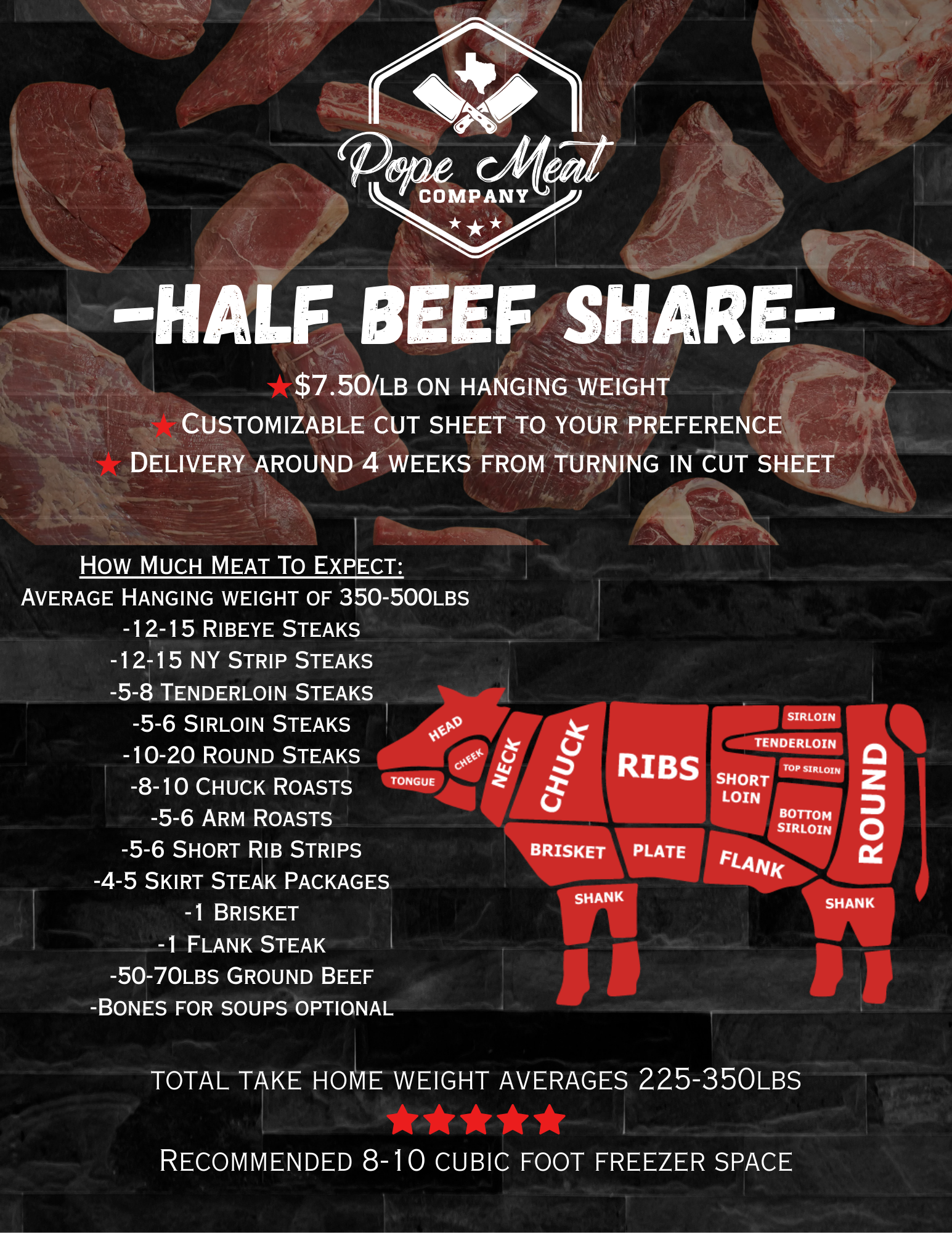 -Each half will yield approximately 50-60% of the Hanging Weight as Packaged Cuts